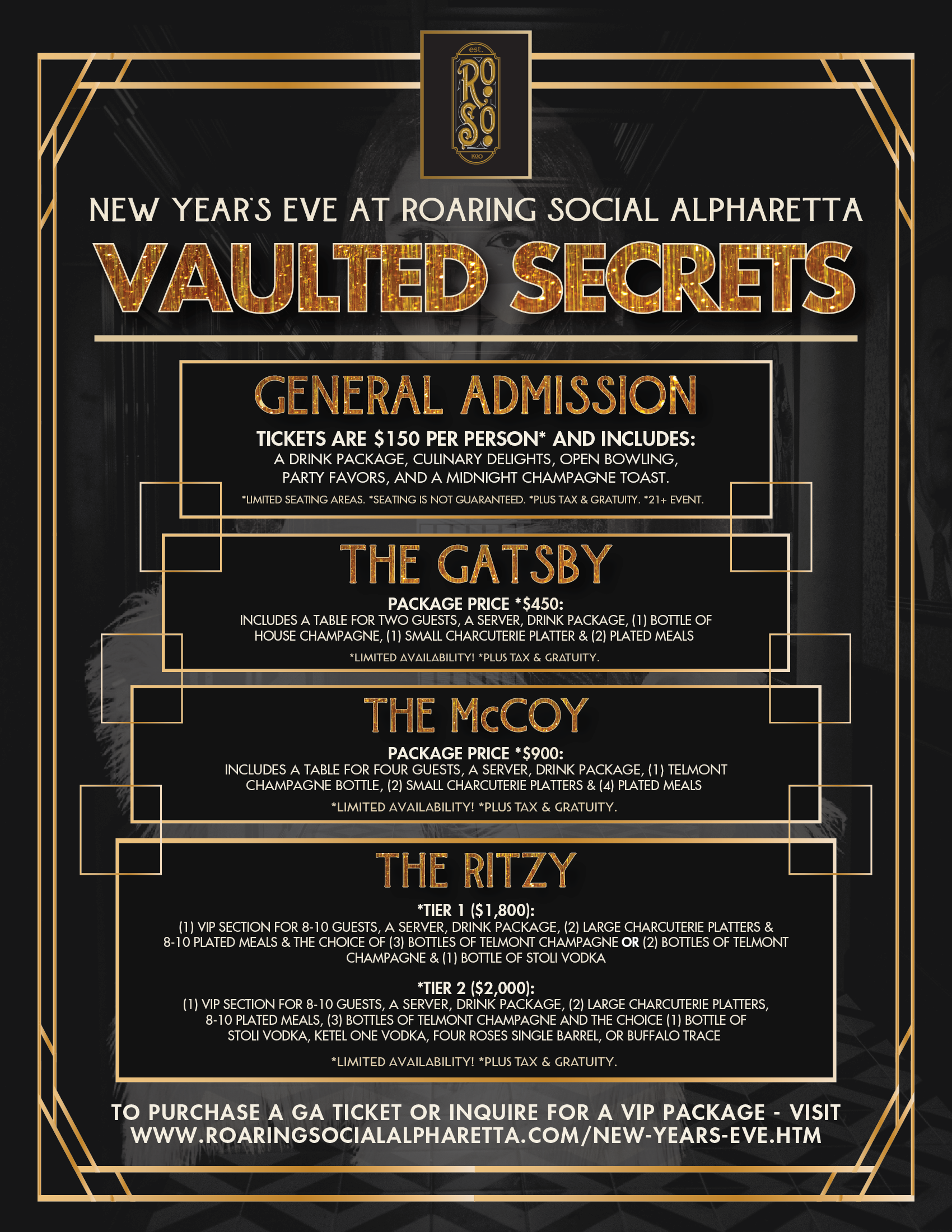 GENERAL ADMISSION TICKETS: (*$150 per person): Includes a Bar Package, Culinary Delights, Bowling, Party Favors, and a Midnight Champagne Toast. *Plus tax and gratuity.